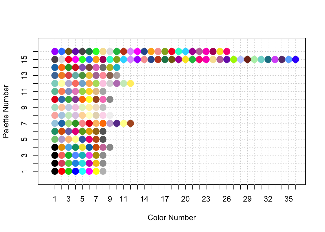 plot(0, type = "n", xaxt = "n", yaxt = "n", xlim = c(0, 36), ylim = c(0, 17), xlab = "Color Number", ylab = "Palette Number")