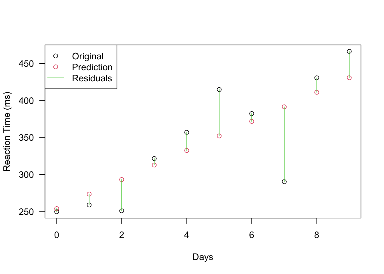 segments(x0 = sleepstudy$Days[1:10], y0 = sleepstudy$Reaction[1:10], x1 = sleepstudy$Days[1:10], y1 = sleepstudy$Reaction[1:10] - residuals[1:10], col = 3)