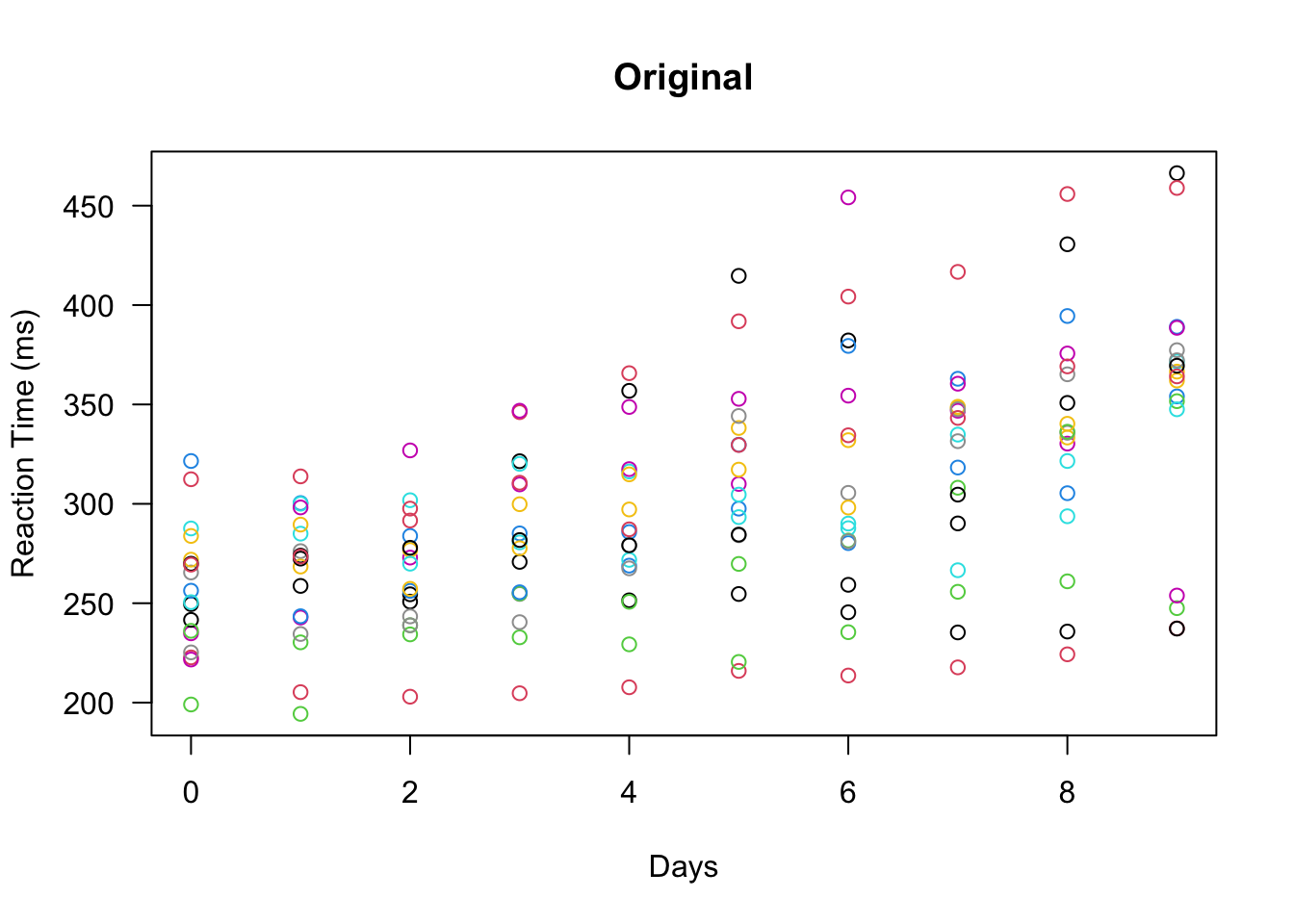 plot(sleepstudy$Days, sleepstudy$Reaction, col = sleepstudy$Subject, xlab = "Days", ylab = "Reaction Time (ms)", yaxt = "n", main = "Original")