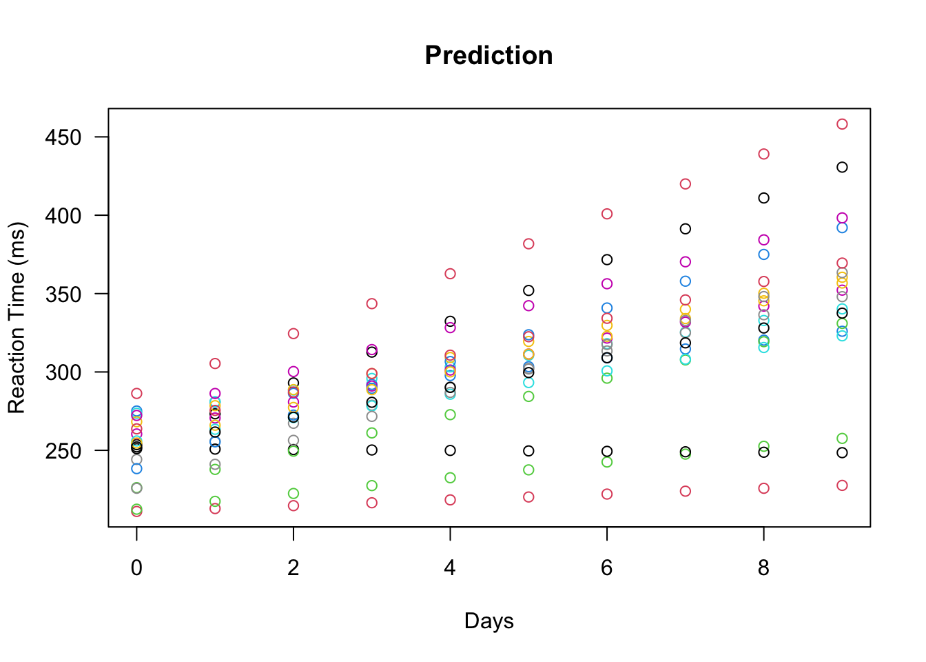 plot(sleepstudy$Days, predictions, col = sleepstudy$Subject, xlab = "Days", ylab = "Reaction Time (ms)", yaxt = "n", main = "Prediction")