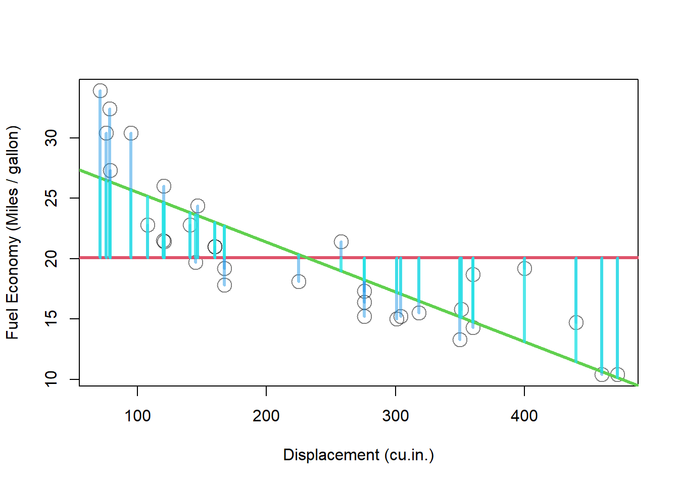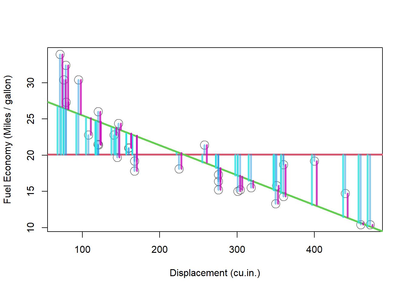 segments(mtcars$disp - offset, model$fitted.values, mtcars$disp - offset, model$fitted.values - deviation_model, col = adjustcolor(5, alpha.f = 0.8), lwd = 3)