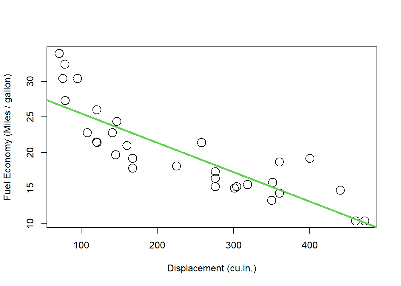 plot(mtcars$disp, mtcars$mpg, cex = 2, xlab = "Displacement (cu.in.)", ylab = "Fuel Economy (Miles / gallon)", col = adjustcolor(1, alpha.f = 0.5))