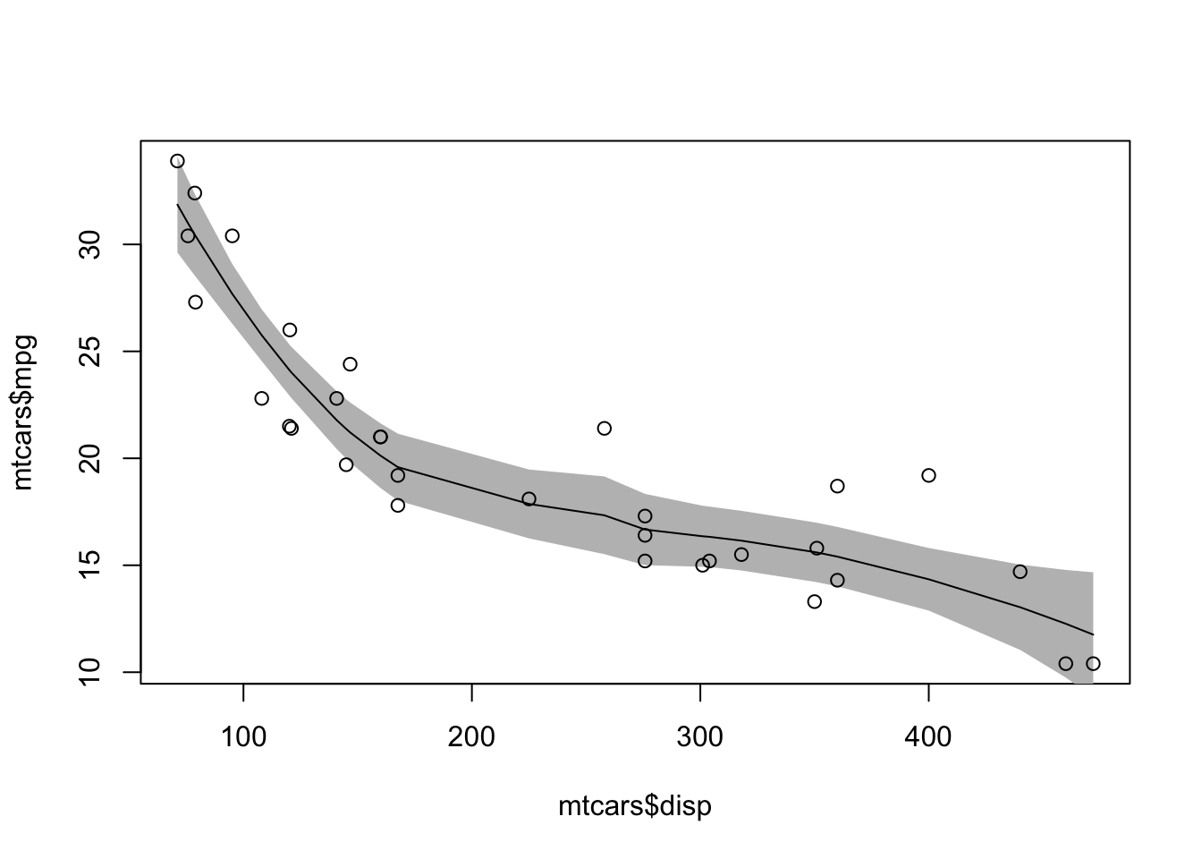 prediction <- predict(model, newdata = data.frame(disp = sort(mtcars$disp)), se = TRUE)