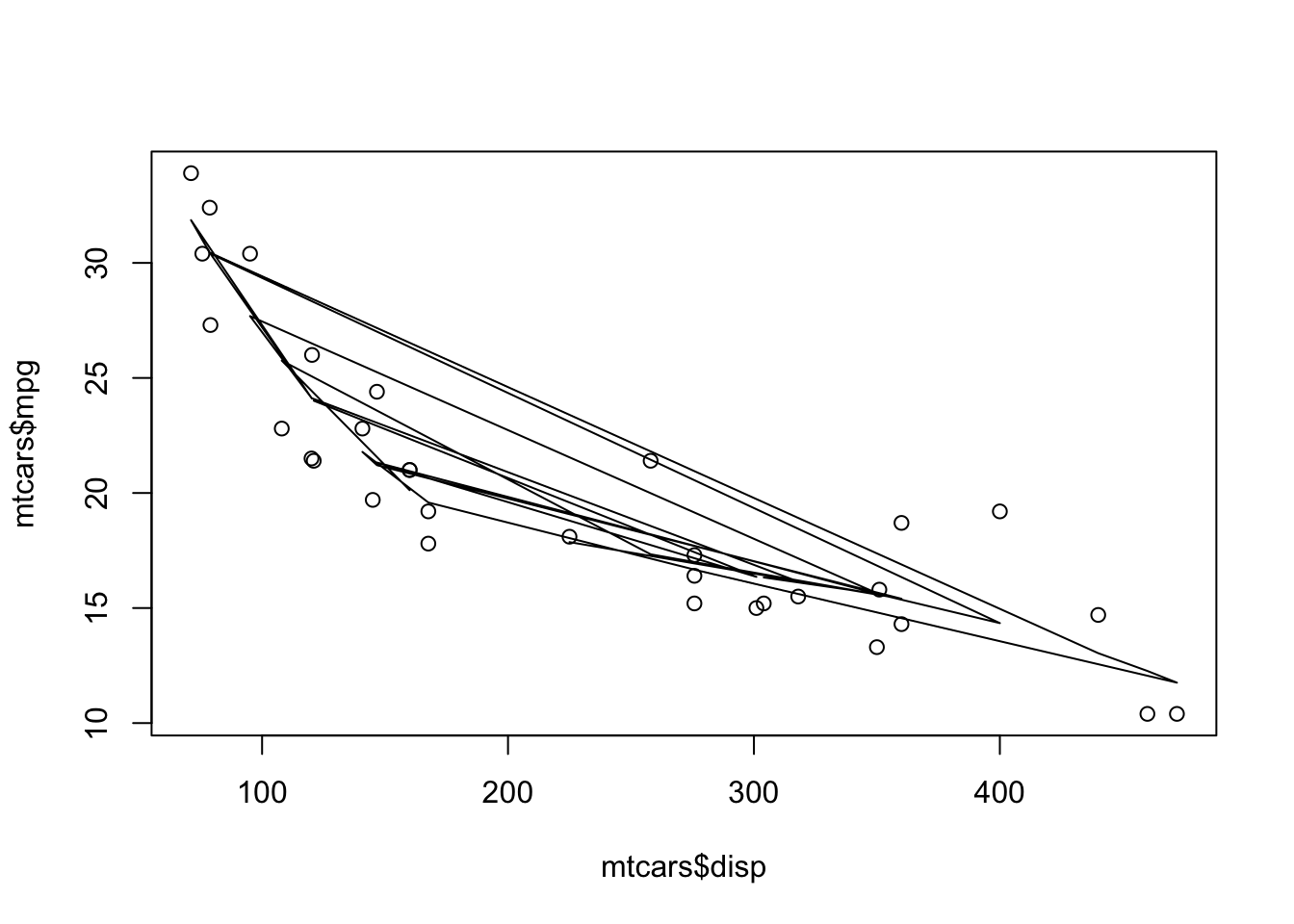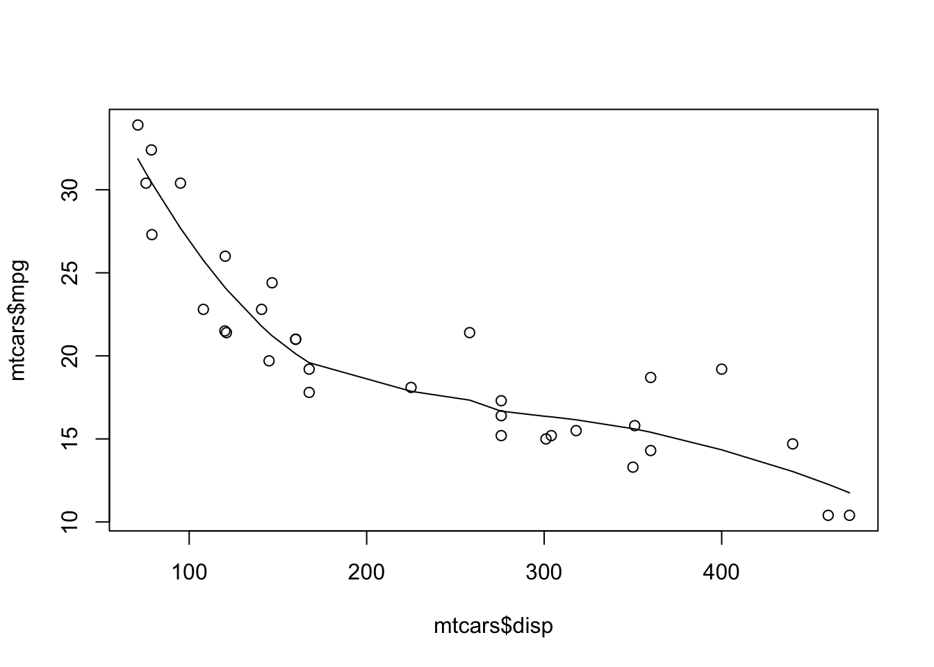 plot(mtcars$disp, mtcars$mpg, type = "n")