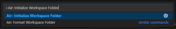 次に、ワークスペースの設定をおこないます。 Ctrl + Shift + P でコマンドパレットを開き(もしくは左下の歯車アイコンをクリックし “Command Palette…” をクリック)、Air: Initialize Workspace Folder と入力します。 コピペせず、手打ちで入力する場合、途中で候補が出ると思います。 これにより、Air の設定ファイルが初期化されます。