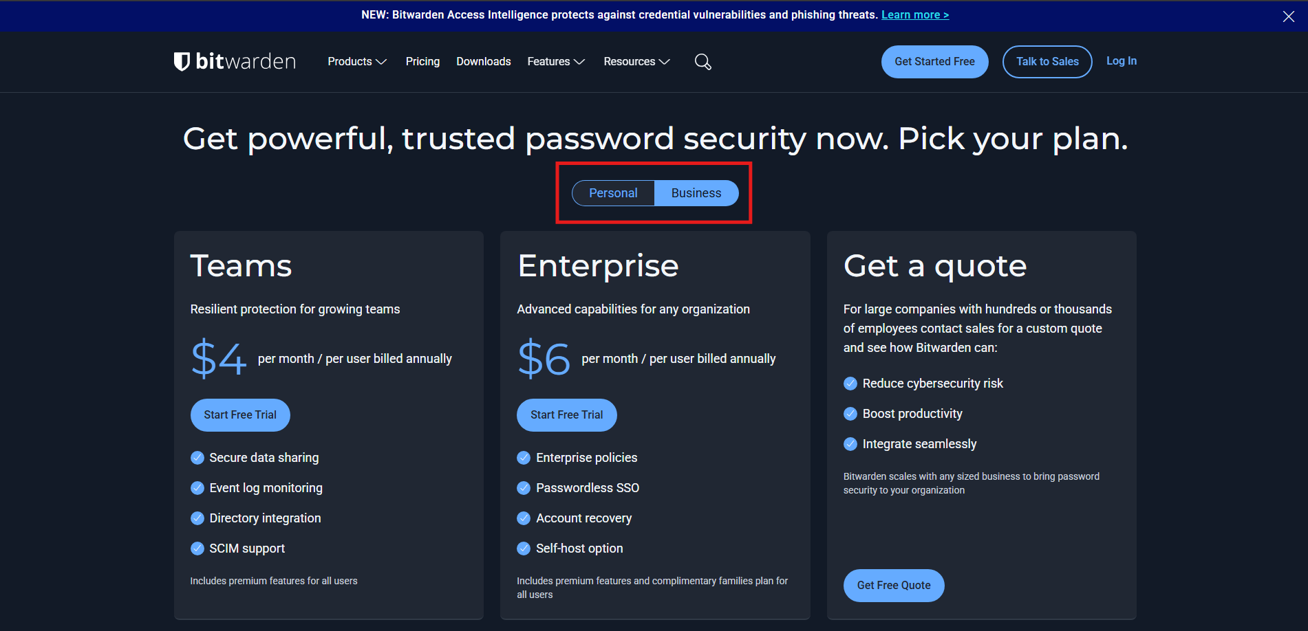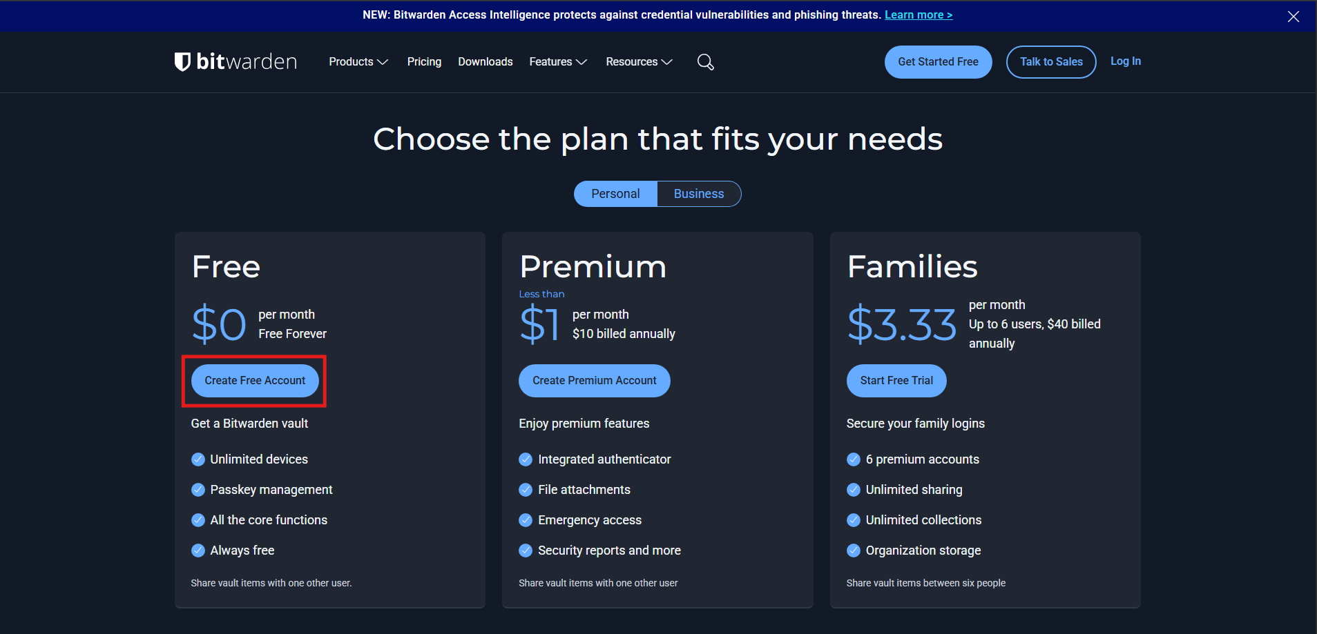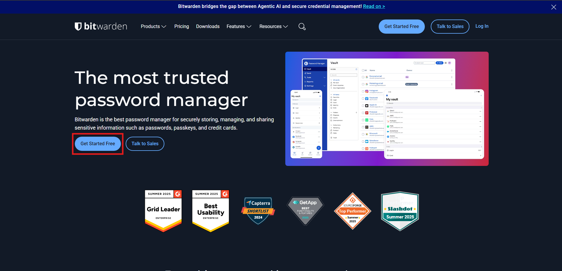 - Bitwardenの公式サイトにアクセスし、[Get Started Free]をクリックします