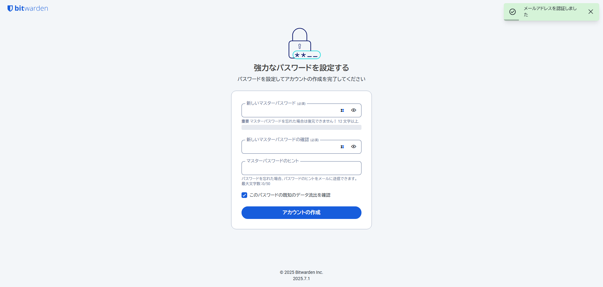 - パスワード設定画面が表示されるので、パスワードを設定し アカウントの作成 をクリックします。マスターパスワードはログインの際に必要になり、これを忘れるとほかのパスワードも見られなくなってしまうと思うので、忘れないようにします。