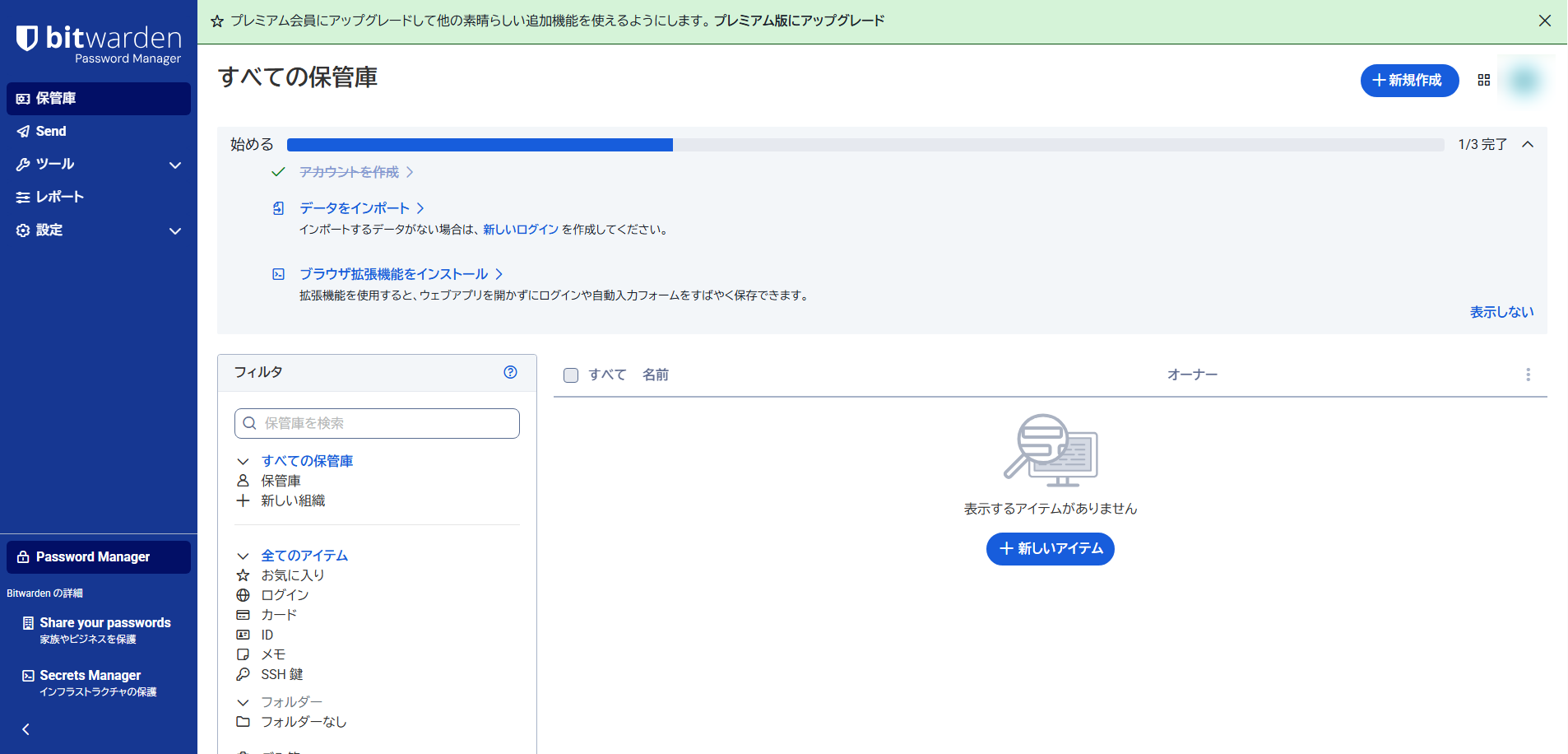 - 設定が完了すると、Bitwardenのダッシュボード(保管庫)が表示されます。これでアカウントの作成は完了です。