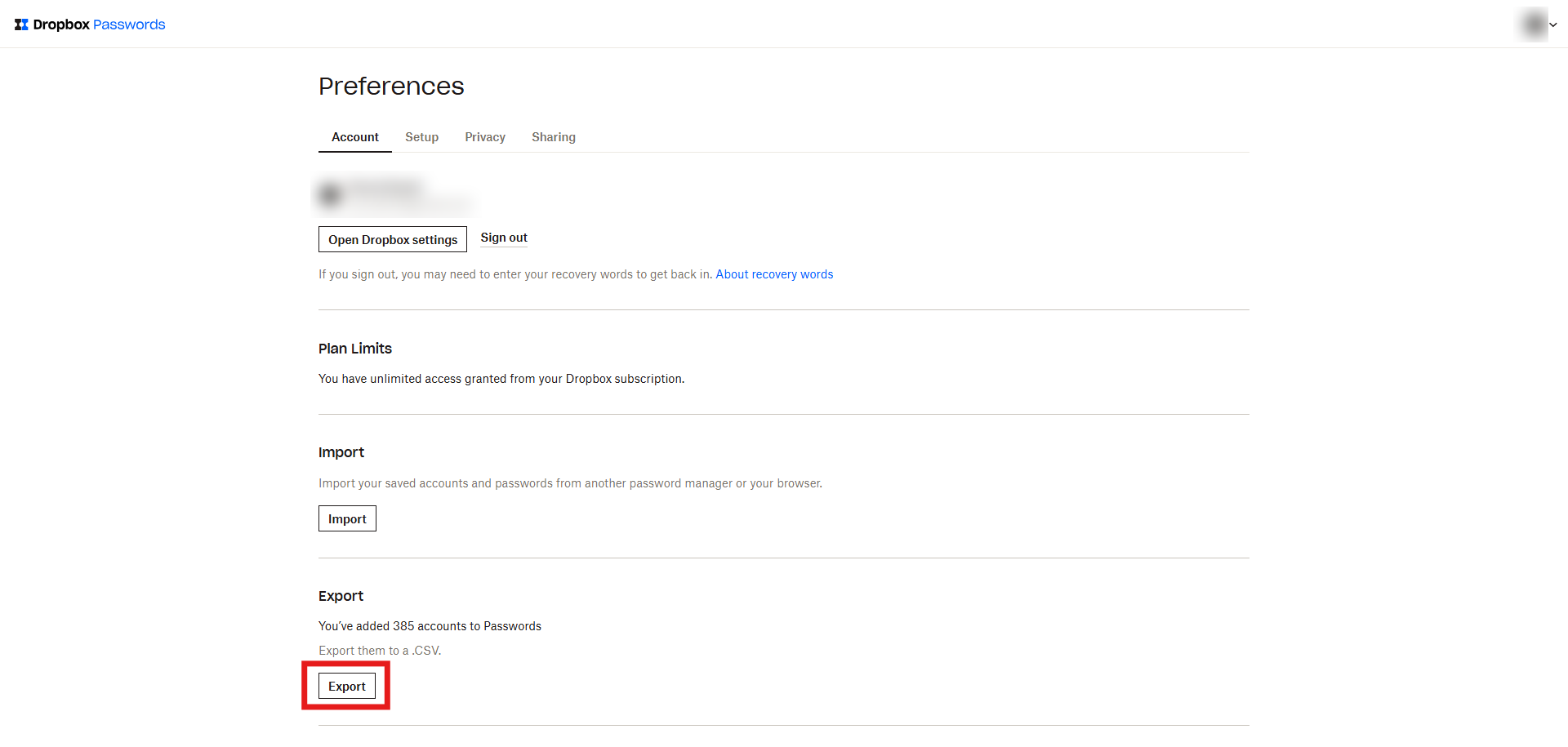 - 設定画面が開きます。[Account]タブ内の[Export]という項目から、[Export]をクリックします。