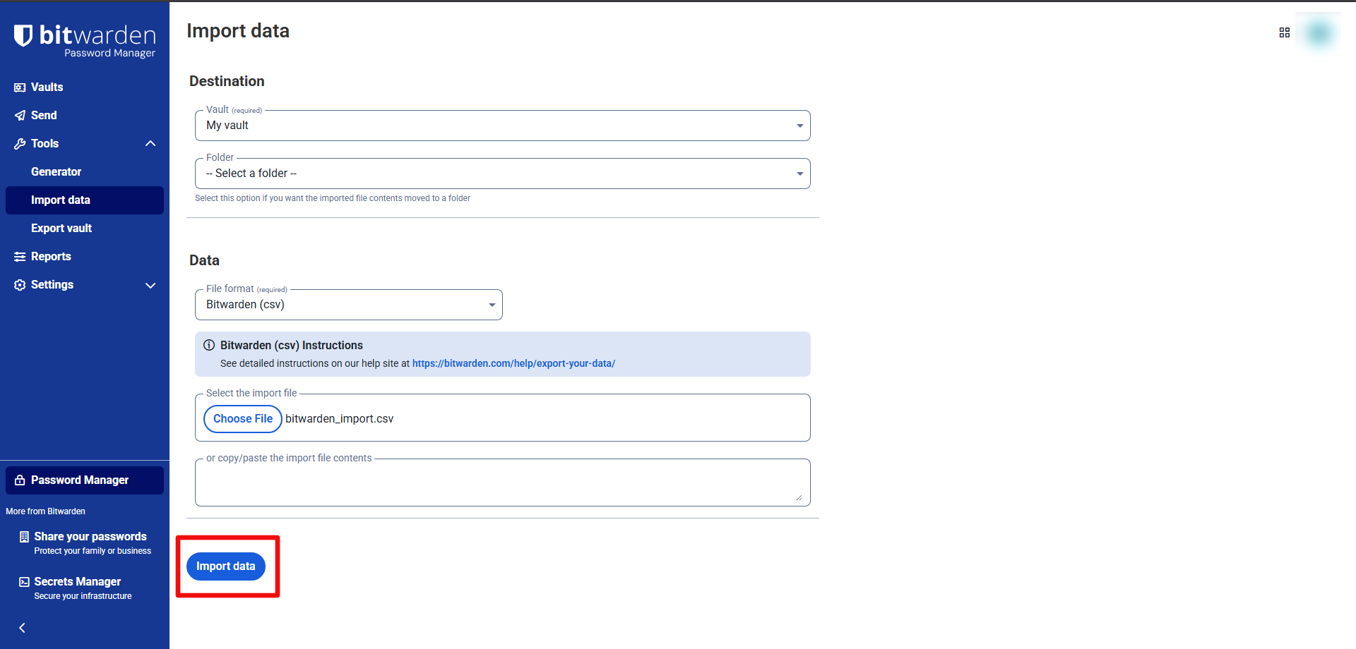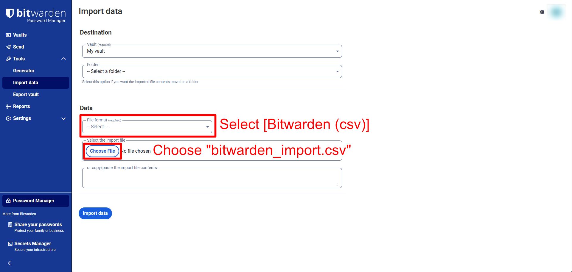 - インポート画面が表示されます。[Data] の [File format (required)]から [Bitwarden CSV] を選択します。