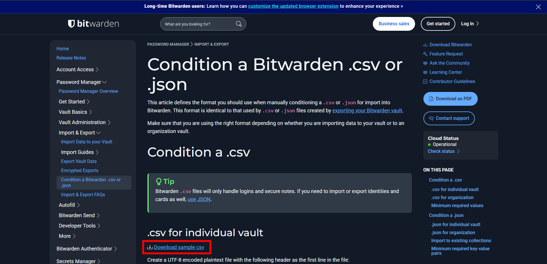 “Condition a .csv” の “.csv for individual vault” に Download sample csv というリンクがあります。 これをクリックして、サンプルCSVファイル(“bitwarden_export.csv”)を任意の場所にダウンロードします。