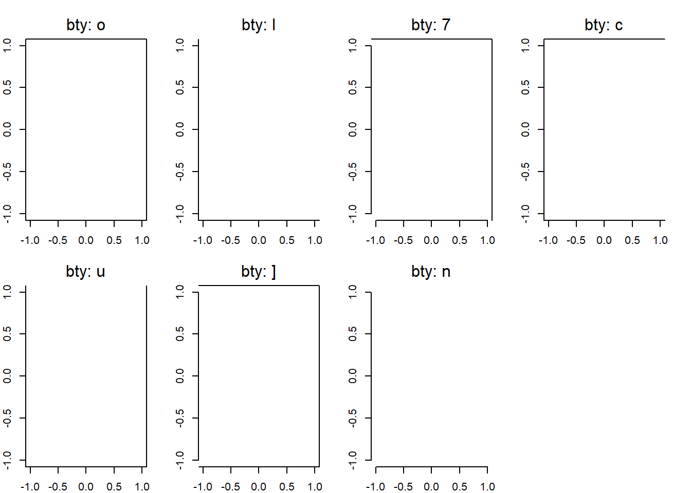 Rでプロットを作成すると、デフォルトで枠が表示されます。 この枠のタイプを bty パラメータで指定できます。