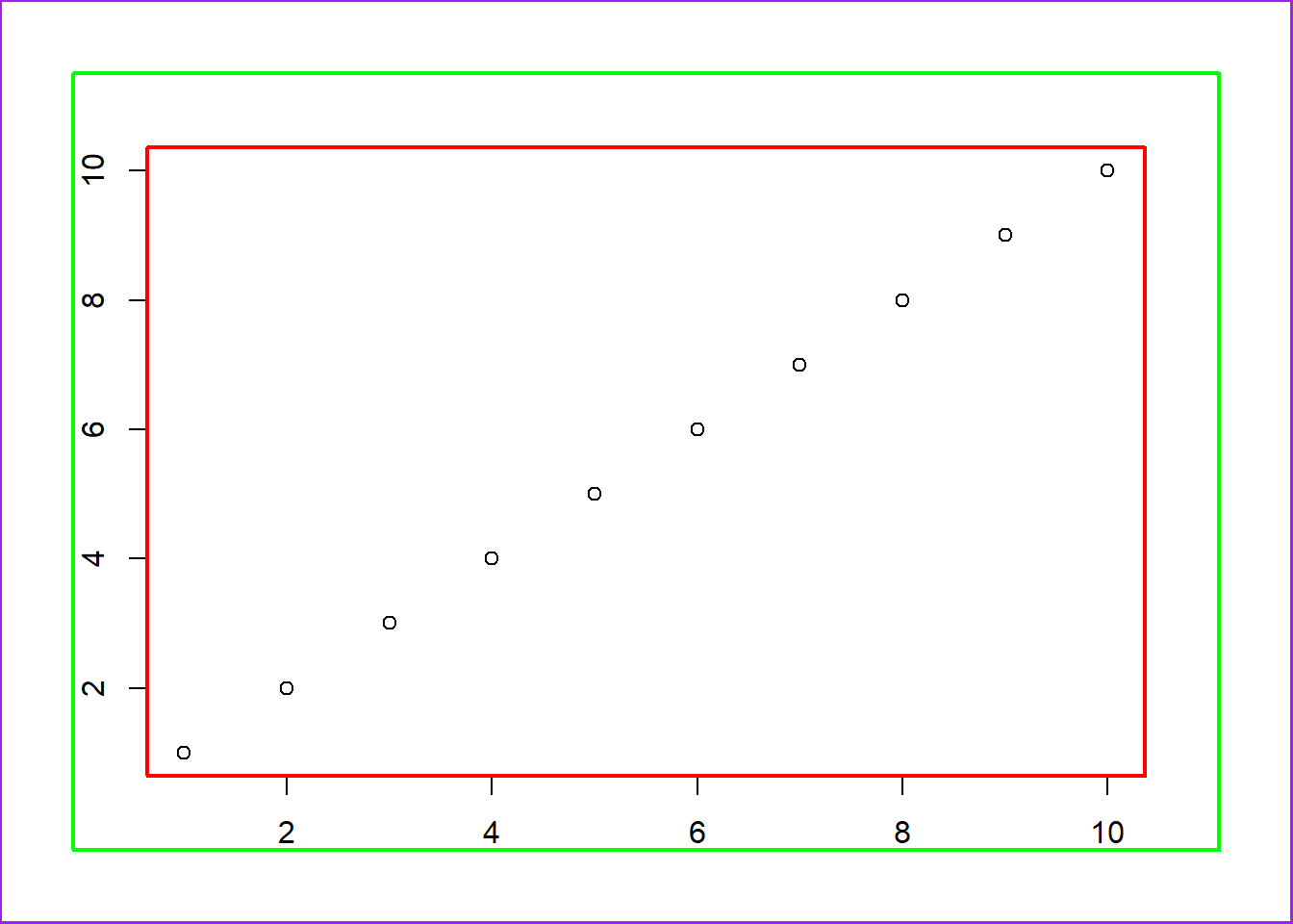 plot(1:10, 1:10, frame.plot = FALSE)枠を後から追加する