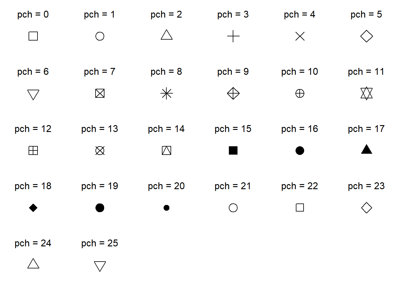 0から25までの数字で指定できます。 0 - 18 までは S 言語というRの前身の言語で定義されたシンボルです。 19 - 25 は R で追加されたシンボルです。