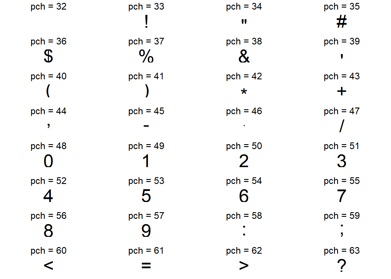 - 負の整数: Unicode コードポイントを指定(例:pch = -0x2642L → ♂, pch = -0x20ACL → €)(ただし未対応フォントや不正なコードポイントの場合は四角や空白になる)