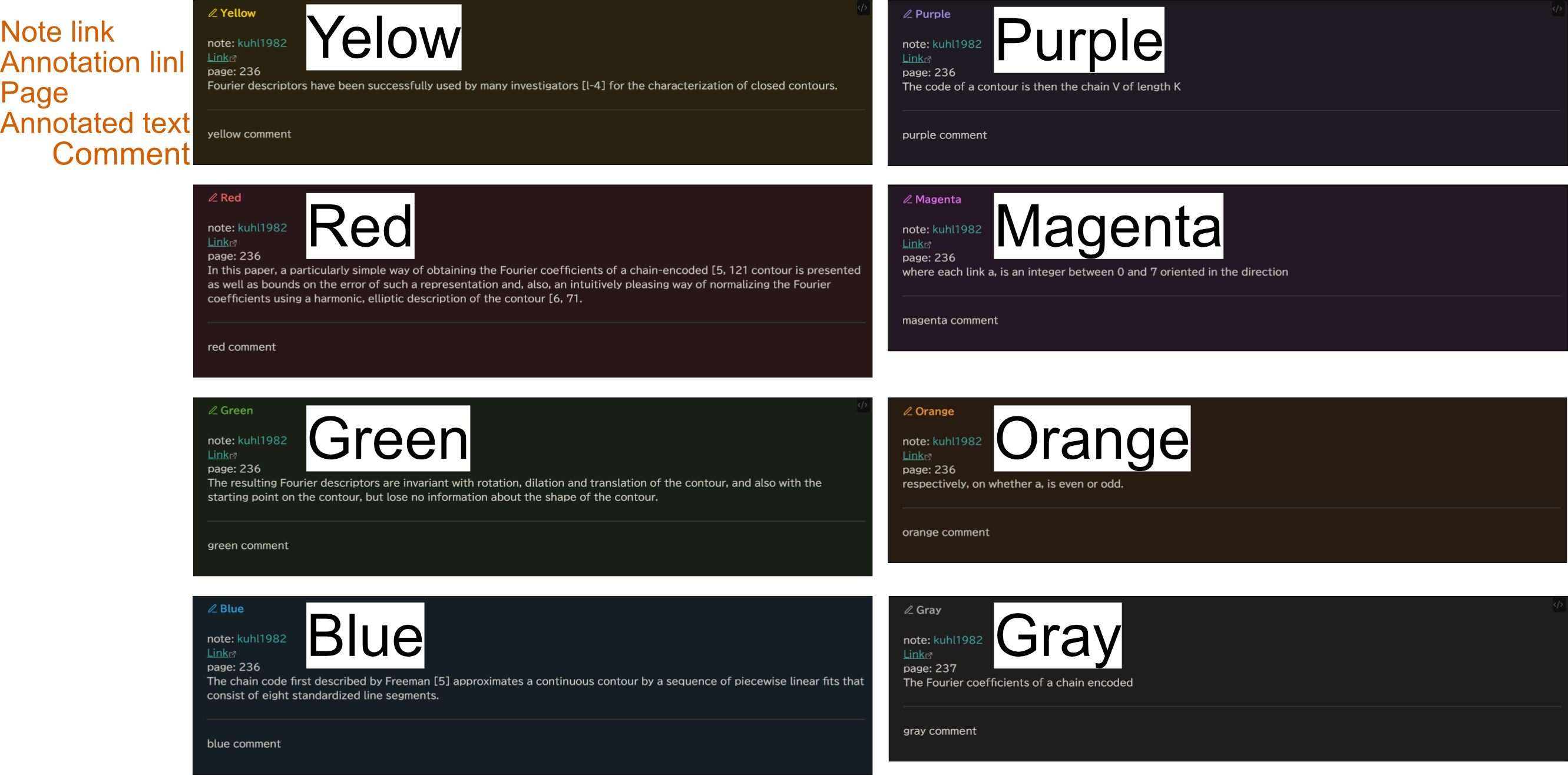 それぞれ、注釈ボックスには上からノートへのリンク、Zotero のリンク、ページ番号、注釈の内容、コメントが含まれています。