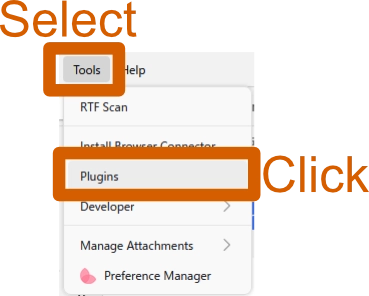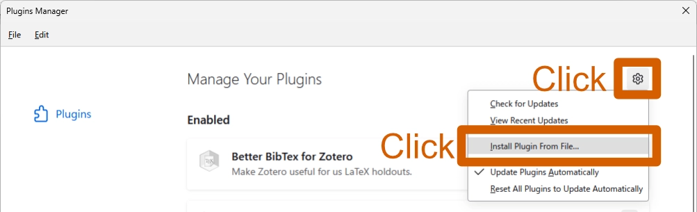 - Zotero を開き、メニューの [Tools] > [Plugins] をクリックします。