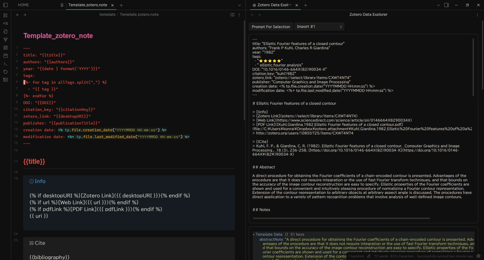 例えば、{{ title }} と書くと、Zotero の文献のタイトルが挿入されたり、{{ abstractNote }} と書くと要約が挿入されたりします。