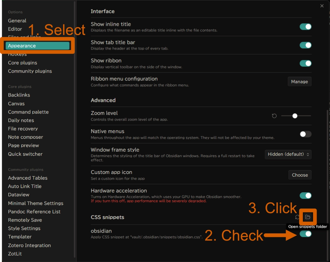 以下のコードを Obsidian の obsidian.css ファイルに追加しました。