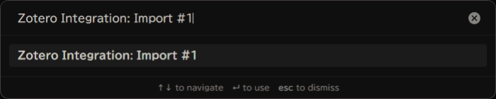 Ctrl + PまたはCmd + P)を開きます。 - Zotero Integration: Import #1 を選択して実行します。