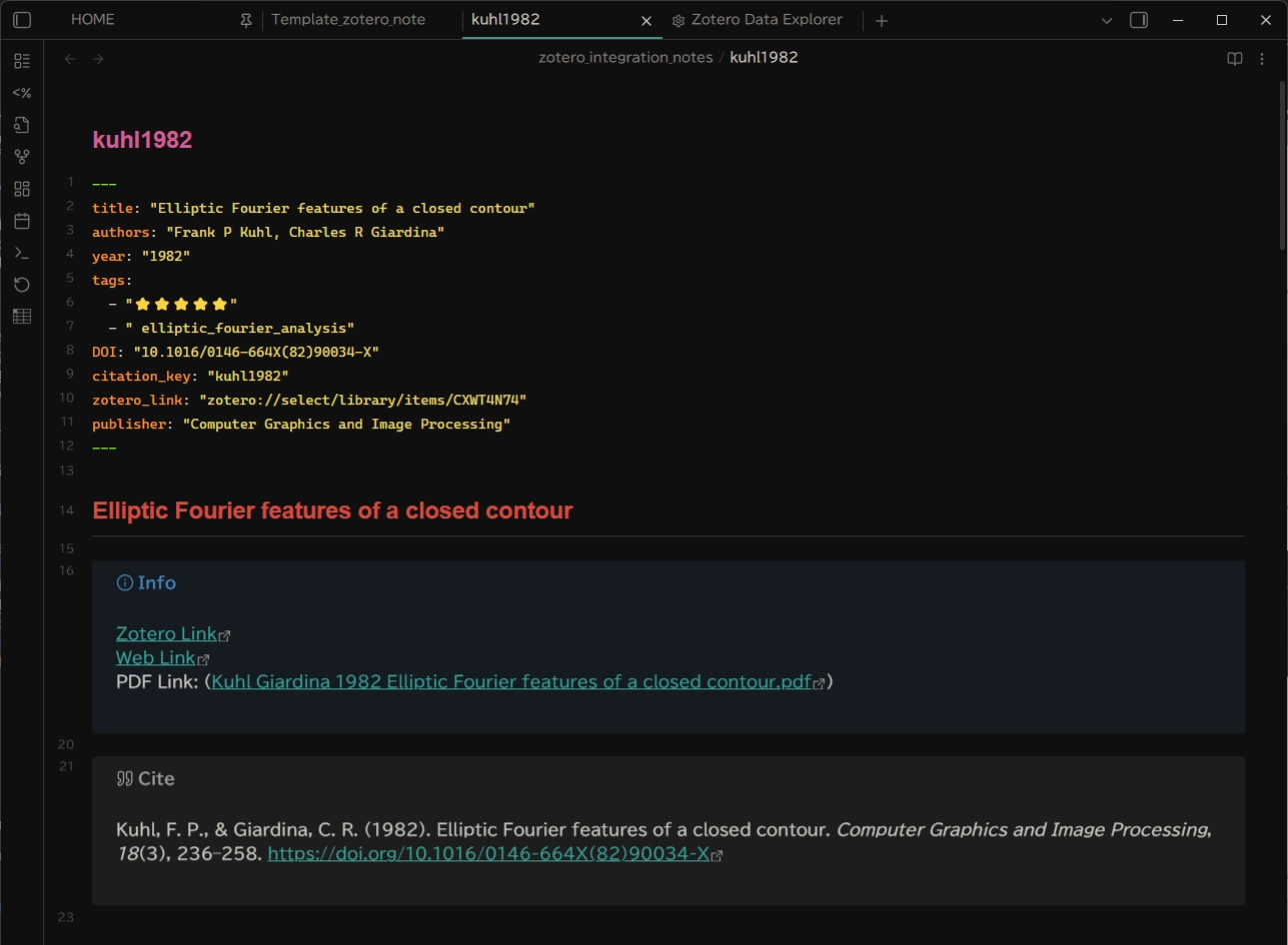 文献の最初には、ノートのメタデータであるフロントマターを、その後に Info ボックスと Cite ボックスが表示されます。