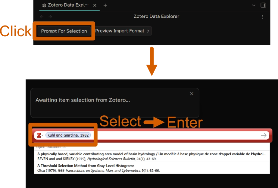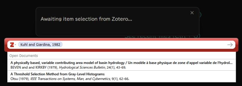 - “Awaiting item selection from Zotero…” と表示され、Zotero の引用のためのウィンドウが開きます。Zotero が起動していないとこのウインドウが開かないので、Zotero を起動しておきます。
