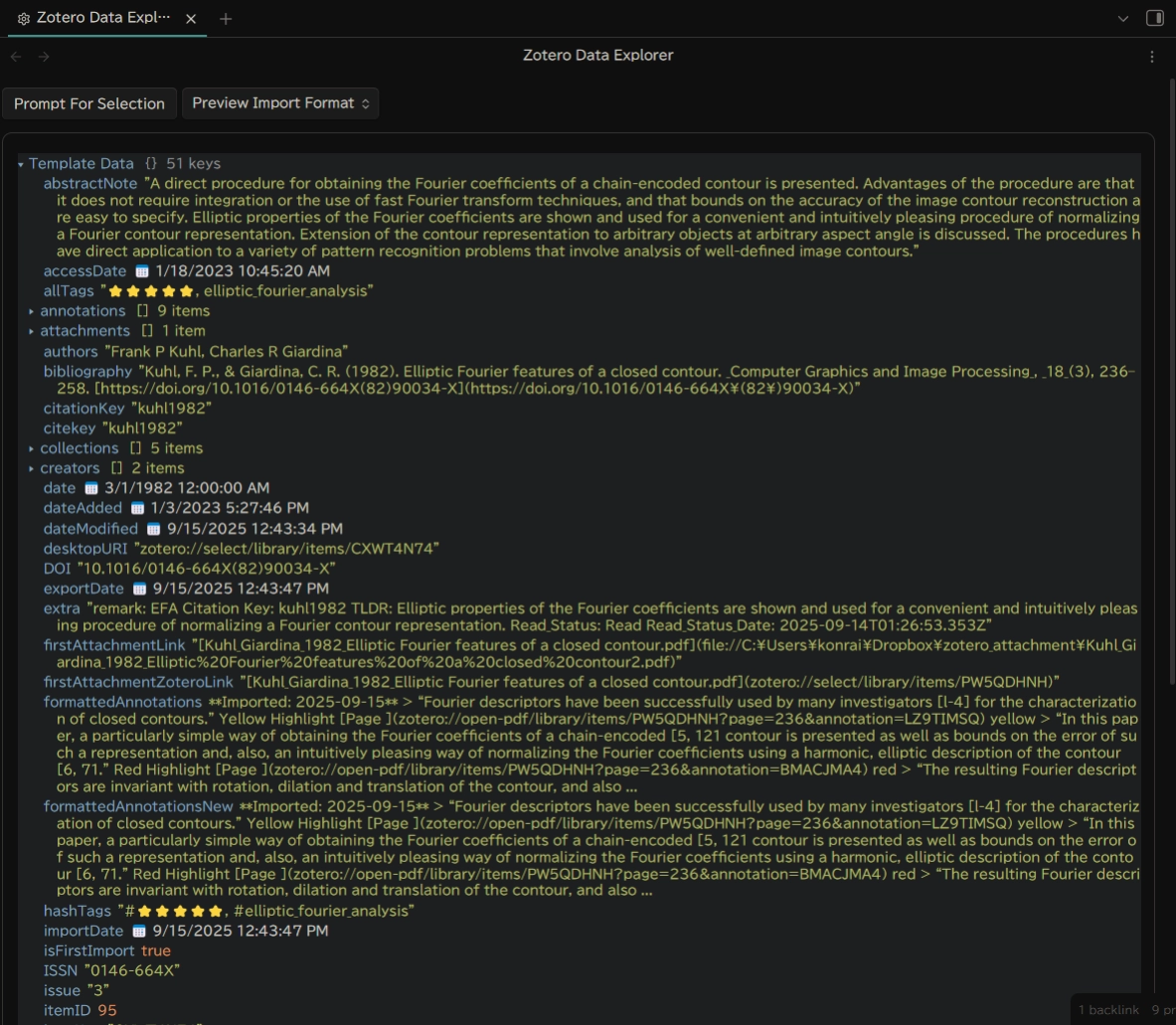 - 選択した文献の情報が表示されます。ここに表示されている変数をテンプレートファイルで使用できます。