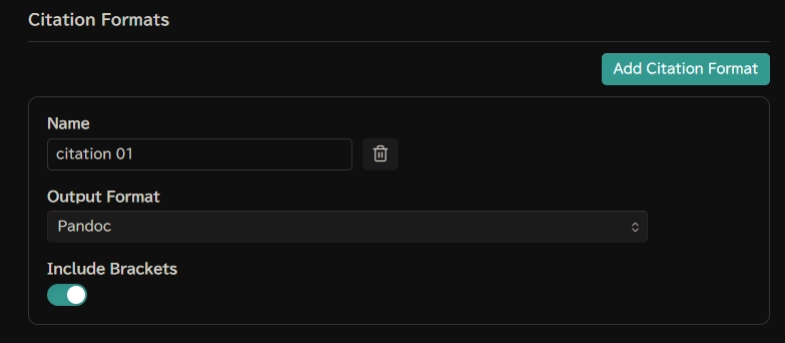 Citation Formats では、引用形式を指定します。 もし一つもなければ、[Add Citation Format] ボタンをクリックして追加します。