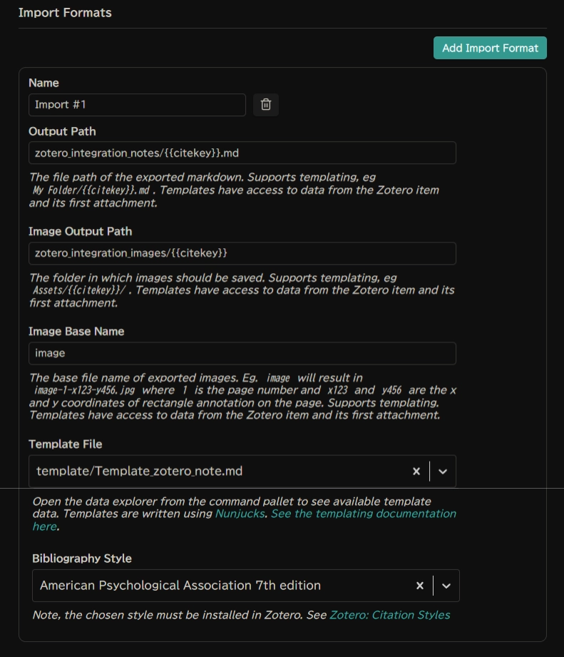 ノートのテンプレートファイルを指定します。 事前に Obsidian 内にテンプレートファイルを作成しておき、そのパスを指定します。 私はtemplate/Template_zotero_note.mdとしました。 内容については後述します。Bibliography Style: 文献の引用スタイルを指定します。 私は American Psychological Association 7th edition としました。 これは APA スタイルの最新版です。 他にも様々なスタイルが選択できます。 一覧やプレビューは Zotero Style Repository をご覧ください。 注意点として、引用したいスタイルが Zotero にダウンロードされている必要があります。 Zotero Style Repository から直接ダウンロード可能です。