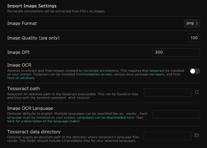Tesseract の実行ファイルのパスを指定します。 もし OCR を有効にする場合は、Tesseract をインストールし、そのパスを指定します。 私は OCR を有効にしていないので、空欄のままです。Image OCR Language: