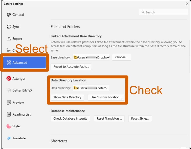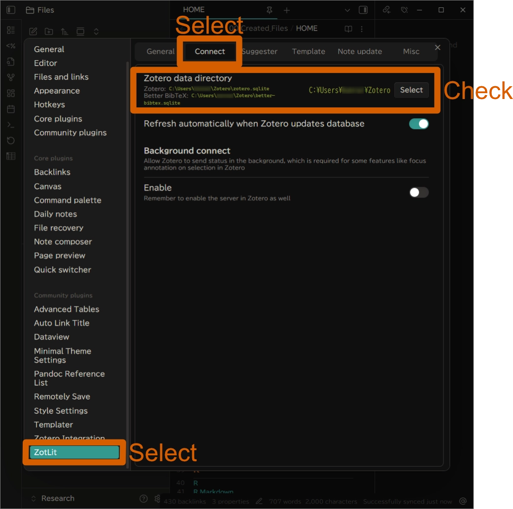 上のタブから [Connect] を選択し、[Zotero data directory] を確認します。 Zotero のデータベースファイルの場所をデフォルトから変更していない場合は、Zotero データベースのパスが自動的に設定されます。もし、Better BibTeX プラグインを Zotero にインストールしている場合は、Better BibTeX のデータベースパスも表示されます。