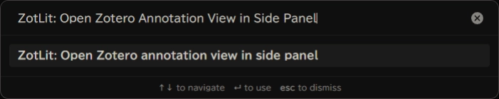 Ctrl + P(Windows) またはCmd + P(Mac) です。 - 「ZotLit: Open Zotero Annotation View in Side Panel」と入力して選択します。