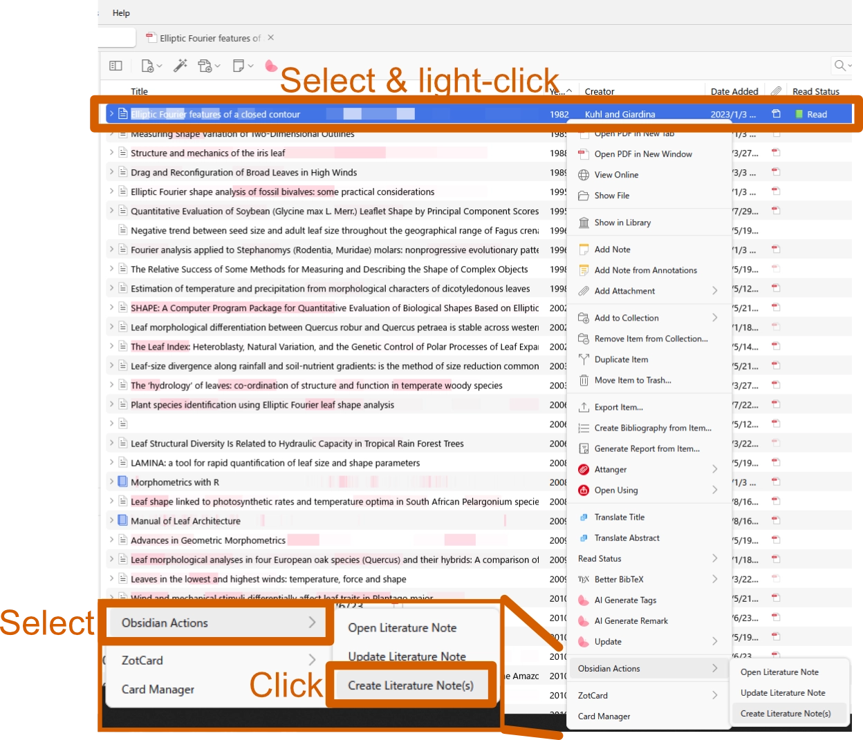右クリックして、コンテキストメニューを開き、[Obsidian Actions] > [Create Literature Note(s)] をクリックします。