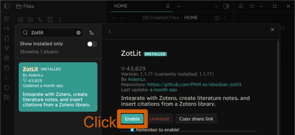 [Settings] > [Community plugins] から [ZotLit] を選択します。