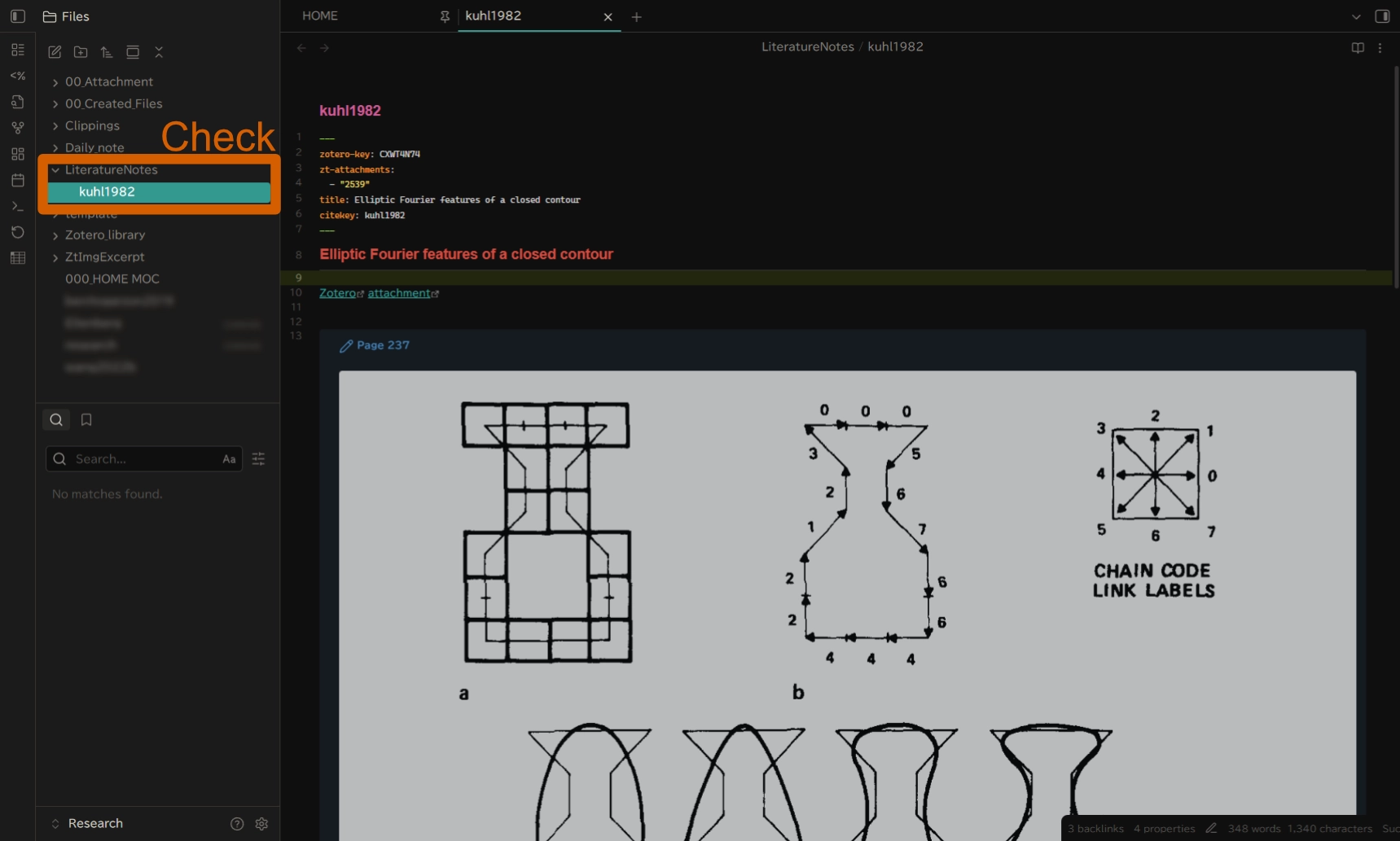 - Obsidian でノートが開き、Zotero の注釈がインポートされます。 ノートは “LiteratureNotes” ファルダに作成され、ファイル名は Better BibTeX プラグインを入れている場合は、 Citation key の名前で保存されるようです。 Better BibTeX プラグインを入れていない場合は、DOI, title, key の順で保存されるようです(変更可能)。