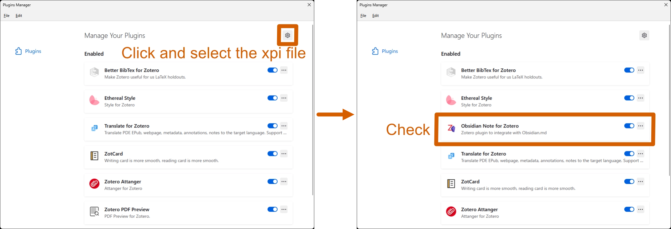 zotero-obsidian-note-1.0.1.xpiファイルを選択します。インストール後、Plugins Manager に Obsidian Noter for Zotero が表示されていることを確認します。 また、右側のチェックボックスがオンになっていることを確認します。