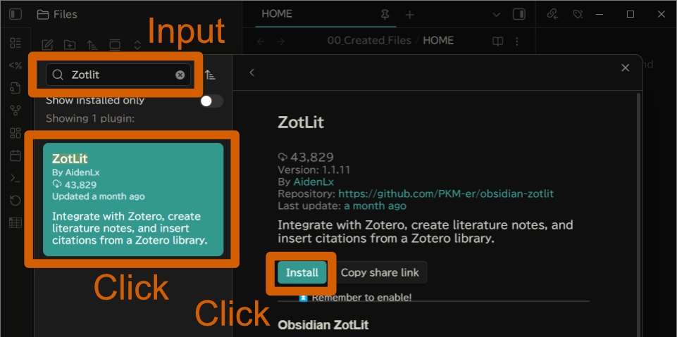- 検索バーに 「ZotLit」 と入力し、表示されたプラグインを選択します。
