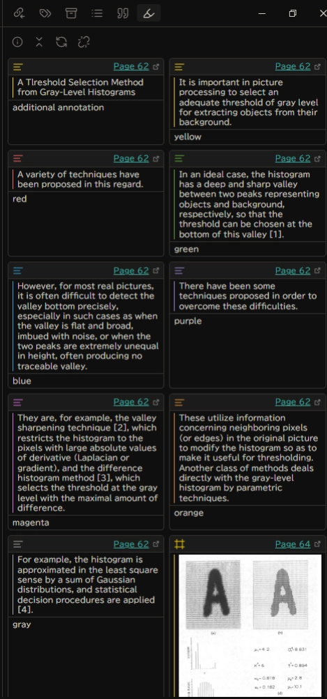 正直なところ、的確な使い道を見いだせていません。 注釈にタグをつけたり、元の論文の情報やリンクをつけておくようにテンプレートを変更すれば、あるトピックに関する注釈をまとめておくのに便利かもしれません。