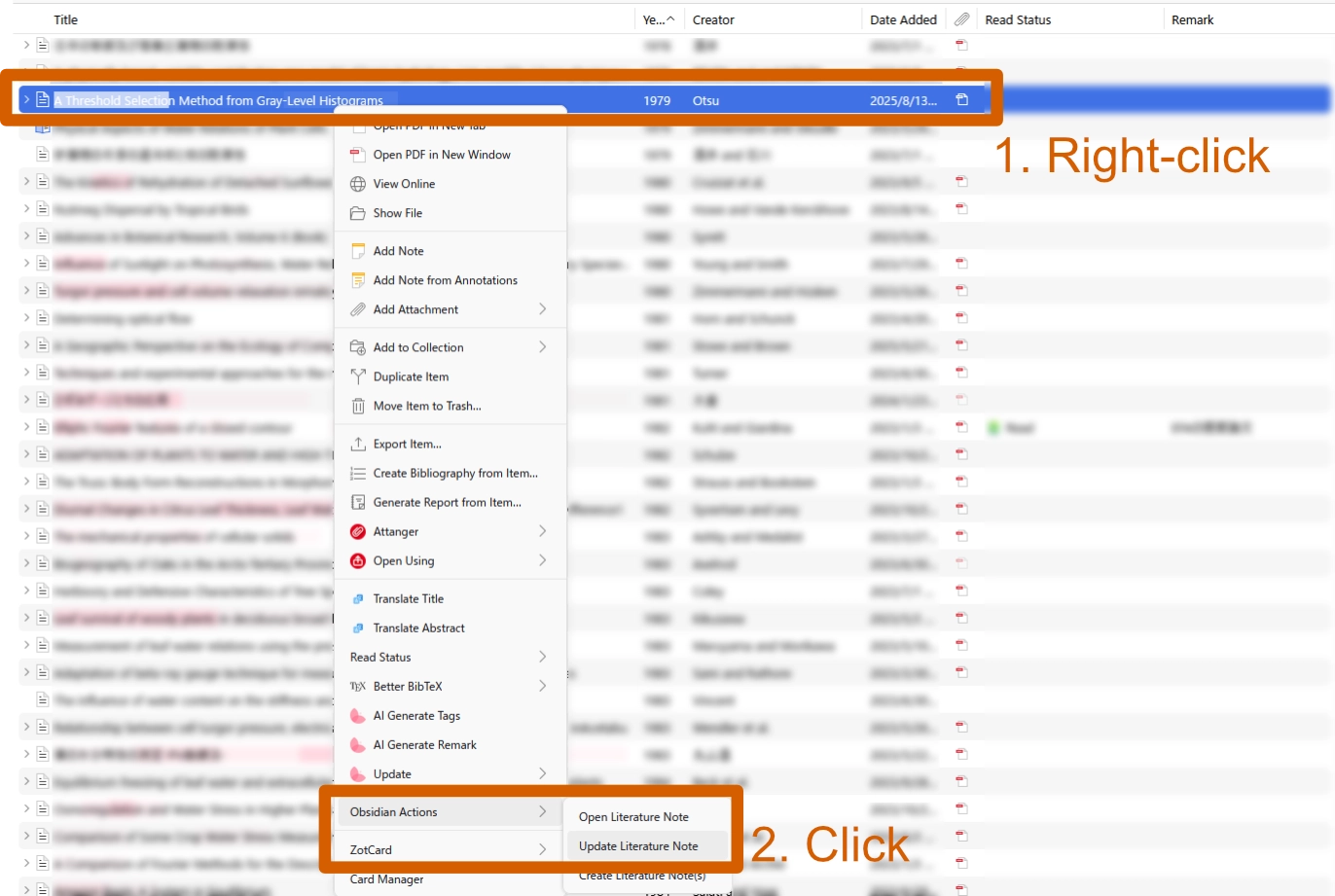 - 右クリックして、コンテキストメニューを開き、[Obsidian Actions] > [Update Literature Note] をクリックします。